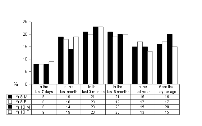 The Schools Health Education Unit (SHEU) have been talking to children adolescents teenagers, about their health and wellbeing, for over 30 years. The results from the Health Related Behaviour Questionnaire (HRBQ) are used by health and education authorities to inform their planning. Among the many topics that are explored in the surveys is the issue of visiting the doctor. As the HRBQ evolved, questions about visiting the doctor were asked in schools from the early 1980s. Responses from over 400,000 12-15 year olds cover issues about frequency of visits and feeling at ease. For example, Chart 1 shows results about the last visit to the doctor.