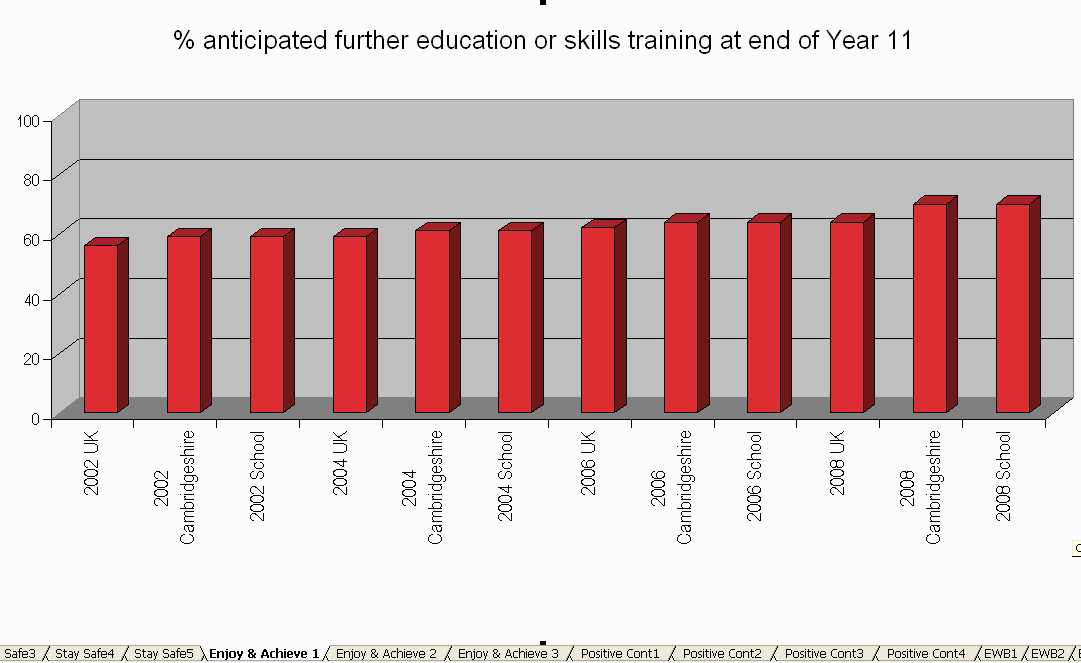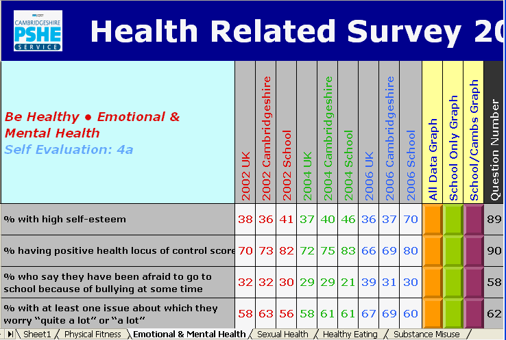 An aggregate local data set also has great value in benchmarking and showing local trends[20]. The Local Authority in Cambridgeshire has taken each school's information over the last 10 years, and given them a spreadsheet showing the school's trends, together with trends in Cambridgeshire and in the SHEU data sets, for questions about bullying and other topics in PSHE education (illustrated).[21] |