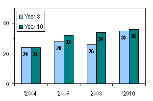 Percentages of pupils in one school who say they are comfortable meeting new people their own age, by year group, 2004-2010
