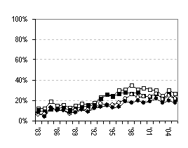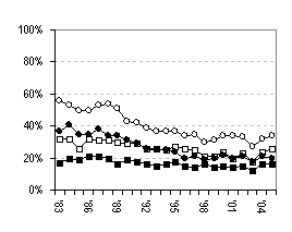 A similar pattern of findings can also be shown for smoking (published online[40]) and for the use of alcohol (unpublished). Trends in alcohol use are not straightforward; we see an increase both in young people who are abstainers and in those who drink beyond any sensible guidelines. |