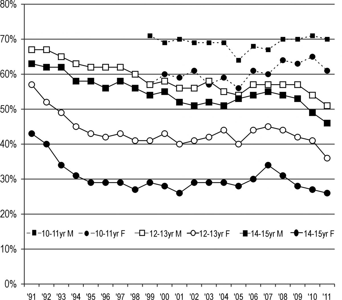 10-15 yr. olds who report being fit or very fit, 1991-2011